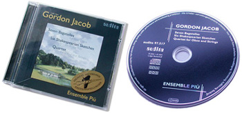 Gordon Jacob (1895-1984) Seven Bagatelles for Solo Oboe 1. March - Alla marcia 2. Elegy - Andante espressivo 3. Waltz - Tempo di valse, poco lento 4. Slow Air - Adagio 5. Limerick - Allegro vivace 6. Chinese Tune - Larghetto 7. Galop - Presto Six Shakespearian Sketches for String Trio 8. „How sweet the moonlight sleeps on yonder bank“ - Adagio misterioso 9. „Foot it featly“ - Allegro leggiero quasi presto 10. „In sad cypress“ - Molto adagio ed elegiaco 11. „Grace in all simplicity“ - Tempo di minuetto 12. „And a’ babbled of green fields“ - Andante con moto 13. „Here a dance of clowns“ - Molto allegro e con brio Quartet for Oboe and Strings 14. Allegro moderato 15. Scherzo.Allegro molto - Presto 16. Andante semplice 17. Rondo.Allegro molto |